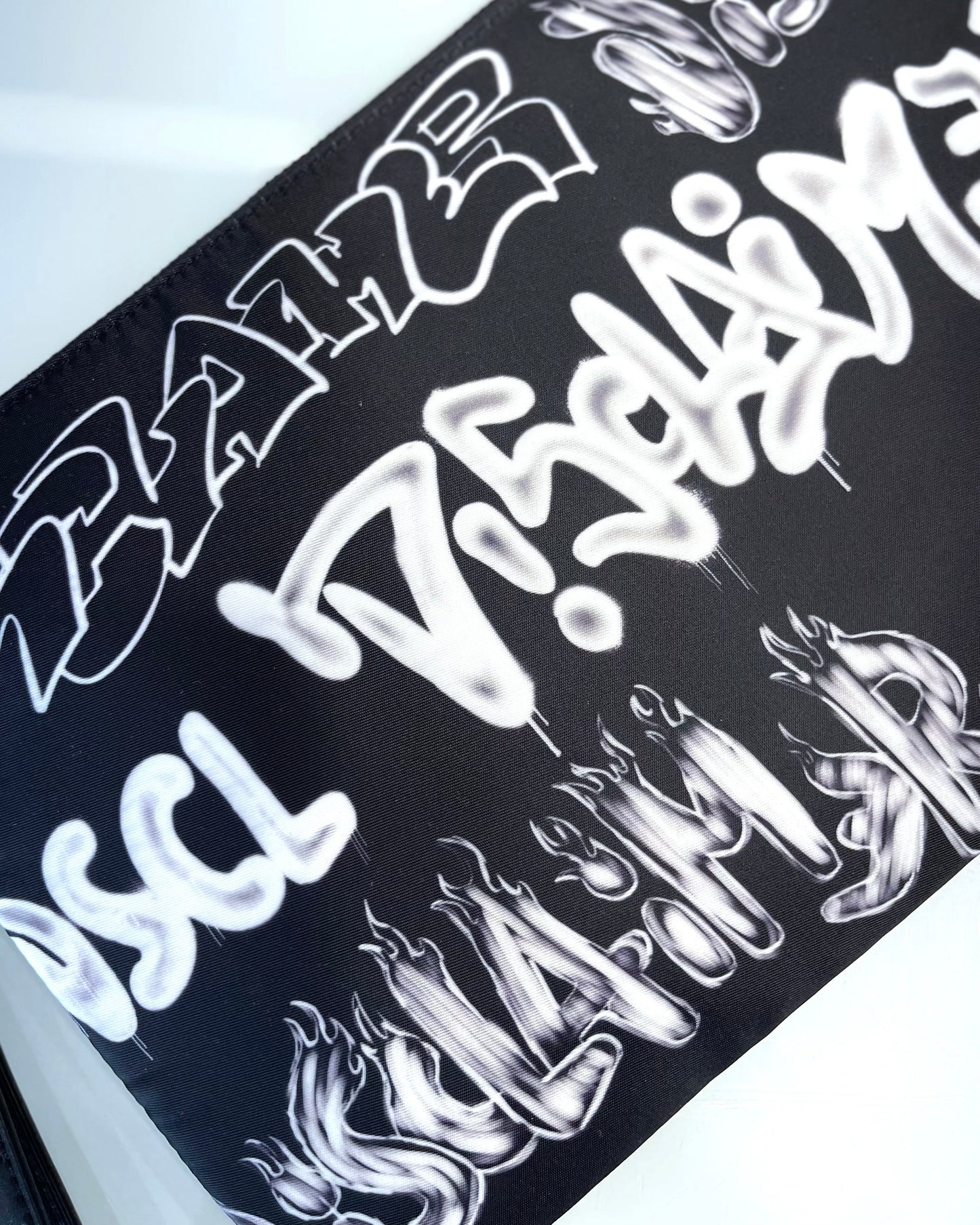 Pochette in tessuto nera con logo disclaimer effetto graffiti, manico con logo